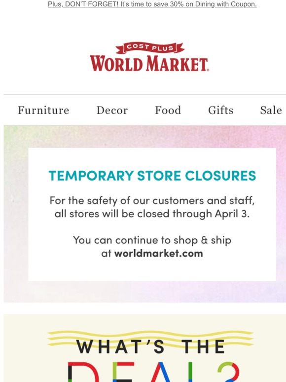 Get World Market Coupon Background. There's always a deal at world market, and they showcase most of their category discounts on the world market coupon page. With the many world market coupons and world market promo codes that often pop up, you can get great furniture for an even better price!